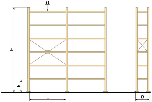 * L – длина полки, B - ширина полки, H – высота стойки, h – высота полки, Q – нагрузка на ярус.